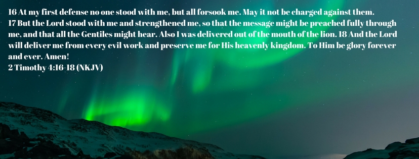17 But the Lord stood with me and strengthened me, so that the message might be preached fully through me, and that all the Gentiles might hear. Also I was delivered out of the mouth of the lion. 18 And the Lord will deliver me from every evil work and preserve me for His heavenly kingdom. To Him be glory forever and ever. Amen!